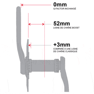 Cet élargissement se répercute également sur le boîtier de pédalier qui est augmenté de 3mm de chaque côté pour maintenir le Q-Factor à 0mm. Il faudra donc utiliser un plateau avec un déport de 3 mm vers l’extérieur.
