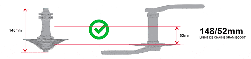 La technologie Boost a pour but d'élargir la dimension des moyeux. Un moyeu arrière passe de 142mm à 148mm et un moyeu avant passe de 100mm à 110mm. La modification du coprs du moyeu arrière va engager un décalage de la ligne de chaine de 3mm.
